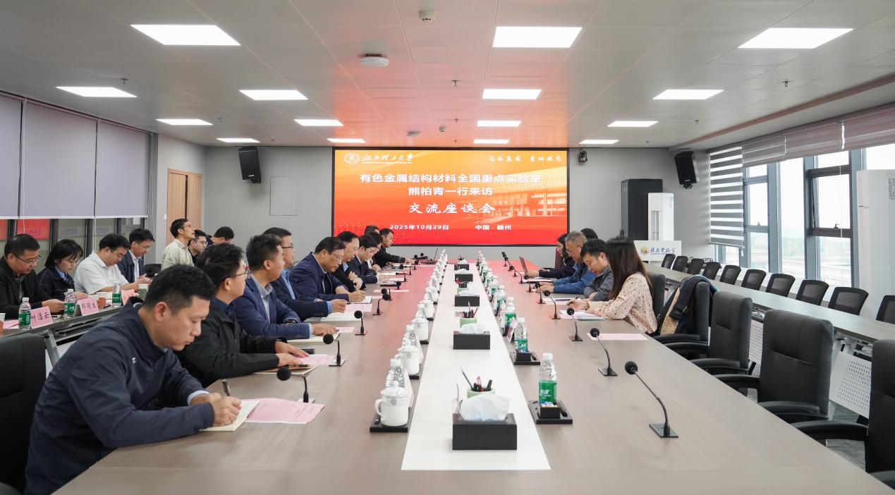 本网讯 10月29日上午,有色金属结构材料全国重点实验室主任熊柏青一行莅临江西理工大学三江校区,围绕2025年全国重点实验室(江理)工作进展为主题开展座谈交流。有色金属结构材料全国重点实验室主任熊柏青、主任研究员李锡武、中国有研科技发展部副总经理(主持工作)尹向前等单位代表参加会议,赣南实验室执行主任、全国重点实验室副主任杨斌,副校长汪航、学术副校长陈斌等出席座谈,会议由汪航主持。