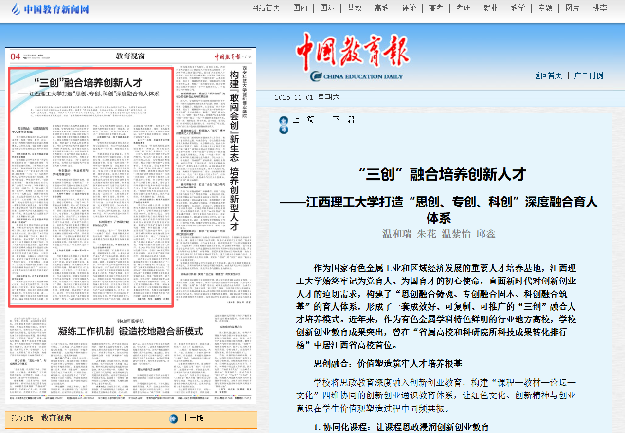 《中国教育报》:“三创”融合培养创新人才 ——江西理工大学打造“思创、专创、科创”深度融合育人体系