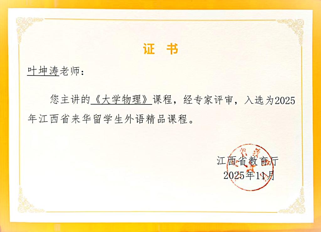 本网讯 11月26日至27日,首届江西省来华留学生外语精品课程展示活动暨教师英文授课能力提升研讨会在南昌举行。我校叶坤涛副教授主讲的《大学物理》课程成功入选首批江西省来华留学生外语精品课程。