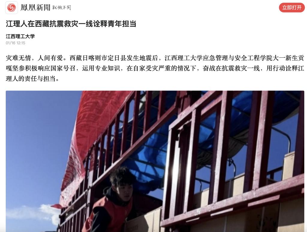 灾难无情,人间有爱。西藏日喀则市定日县发生地震后,江西理工大学应急管理与安全工程学院大一新生贡嘎坚参积极响应国家号召,运用专业知识,在自家受灾严重的情况下,奋战在抗震救灾一线,用行动诠释江理人的责任与担当。