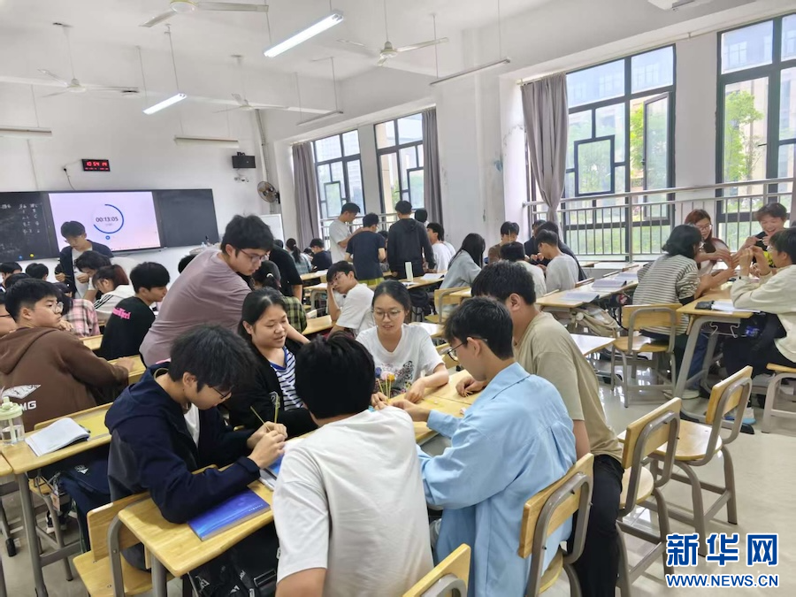 4月24日,江西理工大学大学生创新创业基础课上,学生正在开展“棉花糖”挑战游戏。受访者供图