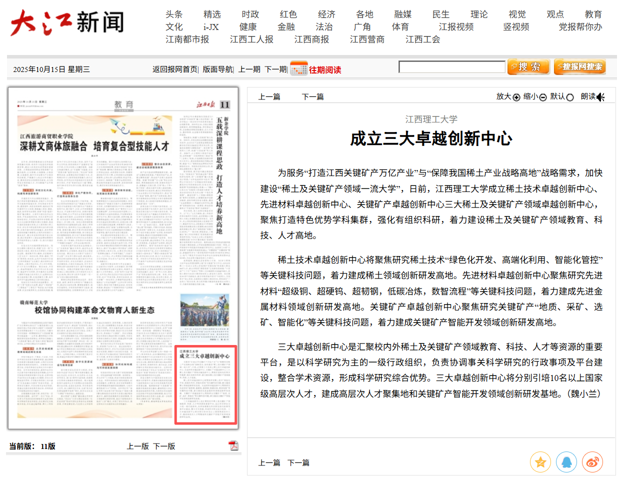 三大卓越创新中心是汇聚校内外稀土及关键矿产领域教育、科技、人才等资源的重要平台,是以科学研究为主的一级行政组织,负责协调事关科学研究的行政事项及平台建设,整合学术资源,形成科学研究综合优势。三大卓越创新中心将分别引培10名以上国家级高层次人才,建成高层次人才聚集地和关键矿产智能开发领域创新研发基地。(魏小兰)