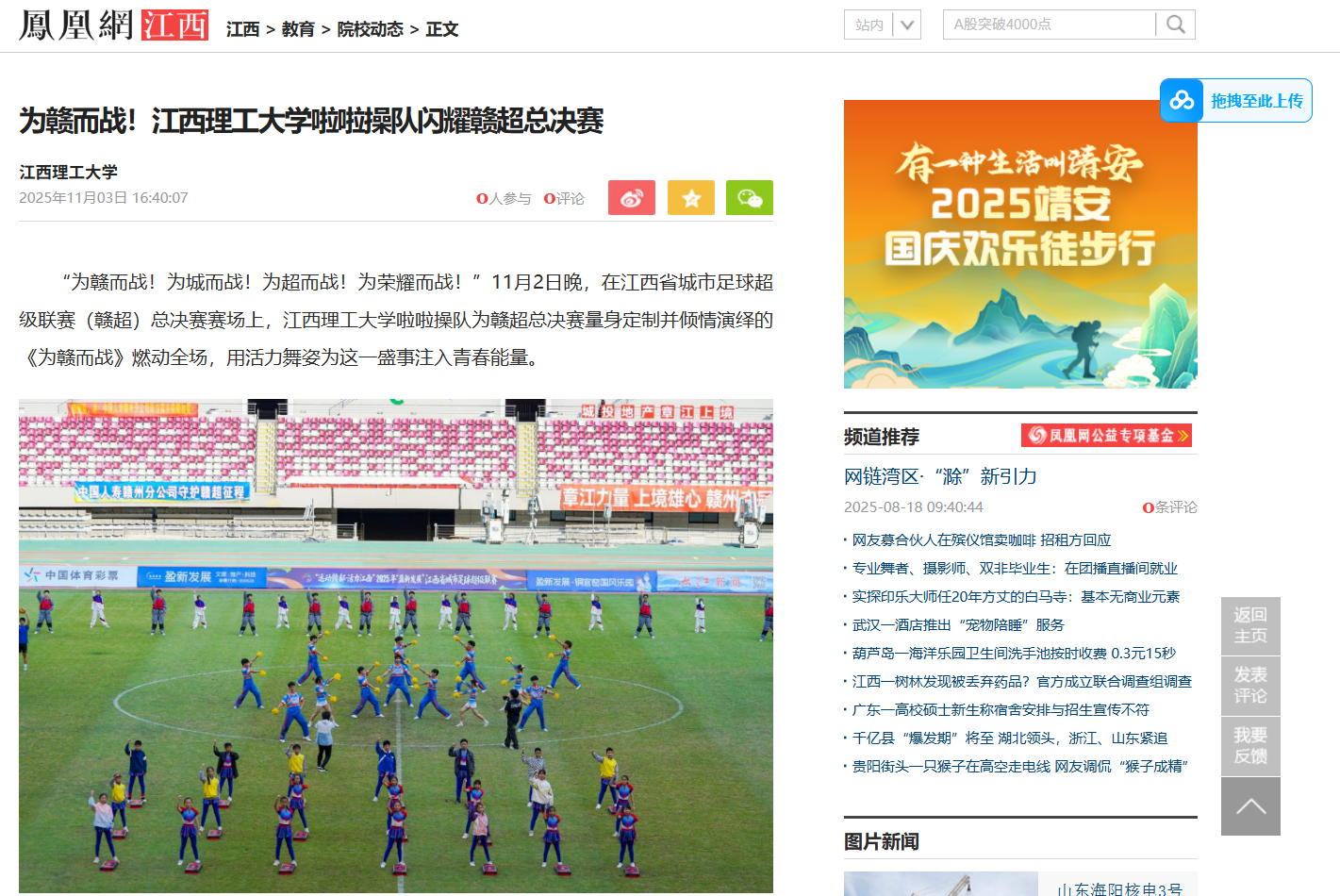 江西理工大学啦啦队助理教练刘炜表示:“希望通过这次表演,向全省球迷传递青春自信、团队拼搏与健康快乐的体育精神,也展现出在赣州这片红色土地上江理青年的奋进力量。”未来,江西理工大学啦啦操队将继续奋进在专业赛事竞技、运动宣传推广的道路上,以更多高水平赛事和表演,为推广体育精神、展现青年学子风采搭建更多平台。(文/蓝浩铭 孙瑞)