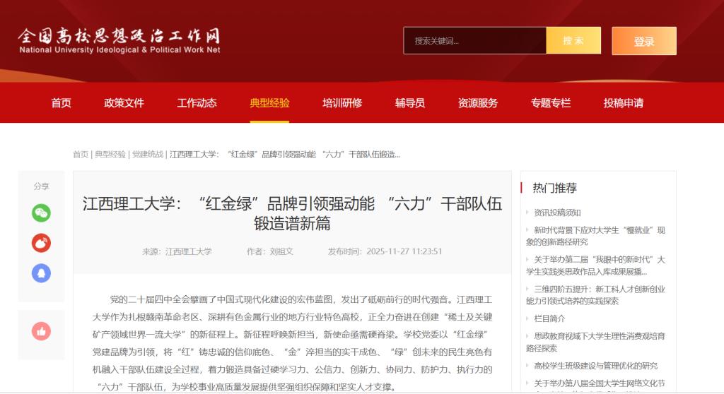 党的二十届四中全会擘画了中国式现代化建设的宏伟蓝图,发出了砥砺前行的时代强音。江西理工大学作为扎根赣南革命老区、深耕有色金属行业的地方行业特色高校,正全力奋进在创建“稀土及关键矿产领域世界一流大学”的新征程上。新征程呼唤新担当,新使命亟需硬脊梁。学校党委以“红金绿”党建品牌为引领,将“红”铸忠诚的信仰底色、“金”淬担当的实干成色、“绿”创未来的民生亮色有机融入干部队伍建设全过程,着力锻造具备过硬学习力、公信力、创新力、协同力、防护力、执行力的“六力”干部队伍,为学校事业高质量发展提供坚强组织保障和坚实人才支撑。