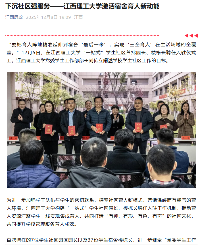 江西理工大学党委常委、副校长宁洁表示,此次社区园长、楼栋长聘任入驻是学校深化学生工作改革的一项重要举措,学校将持续推动学生工作力量下沉一线、扎根社区,紧密结合社区学生所在学科特点、学院特点、社区条件特点加快推进“一站式”成长服务驿站建设,着力把社区打造成集思想引领、学业发展、文化浸润、智慧服务于一体的综合性成长空间,让“一站式”育人功能惠及每一位学子。