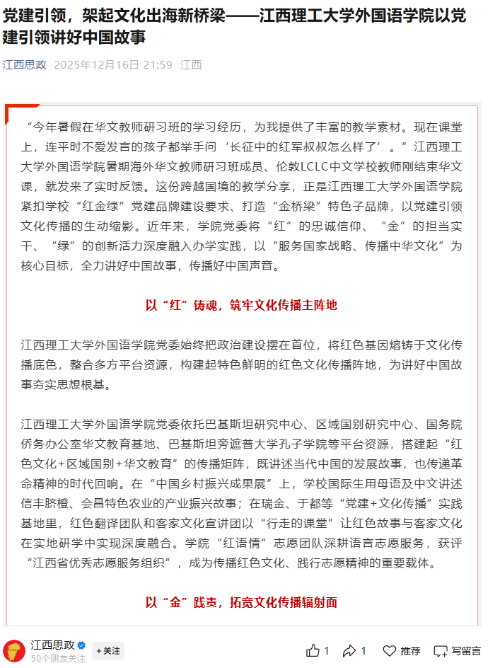 “今年暑假在华文教师研习班的学习经历,为我提供了丰富的教学素材。现在课堂上,连平时不爱发言的孩子都举手问‘长征中的红军叔叔怎么样了’。”江西理工大学外国语学院暑期海外华文教师研习班成员、伦敦LCLC中文学校教师刚结束华文课,就发来了实时反馈。这份跨越国境的教学分享,正是江西理工大学外国语学院紧扣学校“红金绿”党建品牌建设要求、打造“金桥梁”特色子品牌,以党建引领文化传播的生动缩影。近年来,学院党委将“红”的忠诚信仰、“金”的担当实干、“绿”的创新活力深度融入办学实践,以“服务国家战略、传播中华文化”为核心目标,全力讲好中国故事,传播好中国声音。