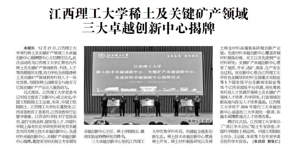本报讯12月21日,江西理工大学举行稀土及关键矿产领域三大卓越创新中心揭牌暨中心主任聘任仪式。此次活动将为江西理工大学汇聚校内外稀土及关键矿产领域教育、科技、人才等资源提供支撑,助力学校全面推进稀土及关键矿产领域教育科技人才一体化发展,为国家稀土战略安全与地方万亿级关键矿产产业注人强劲动力。