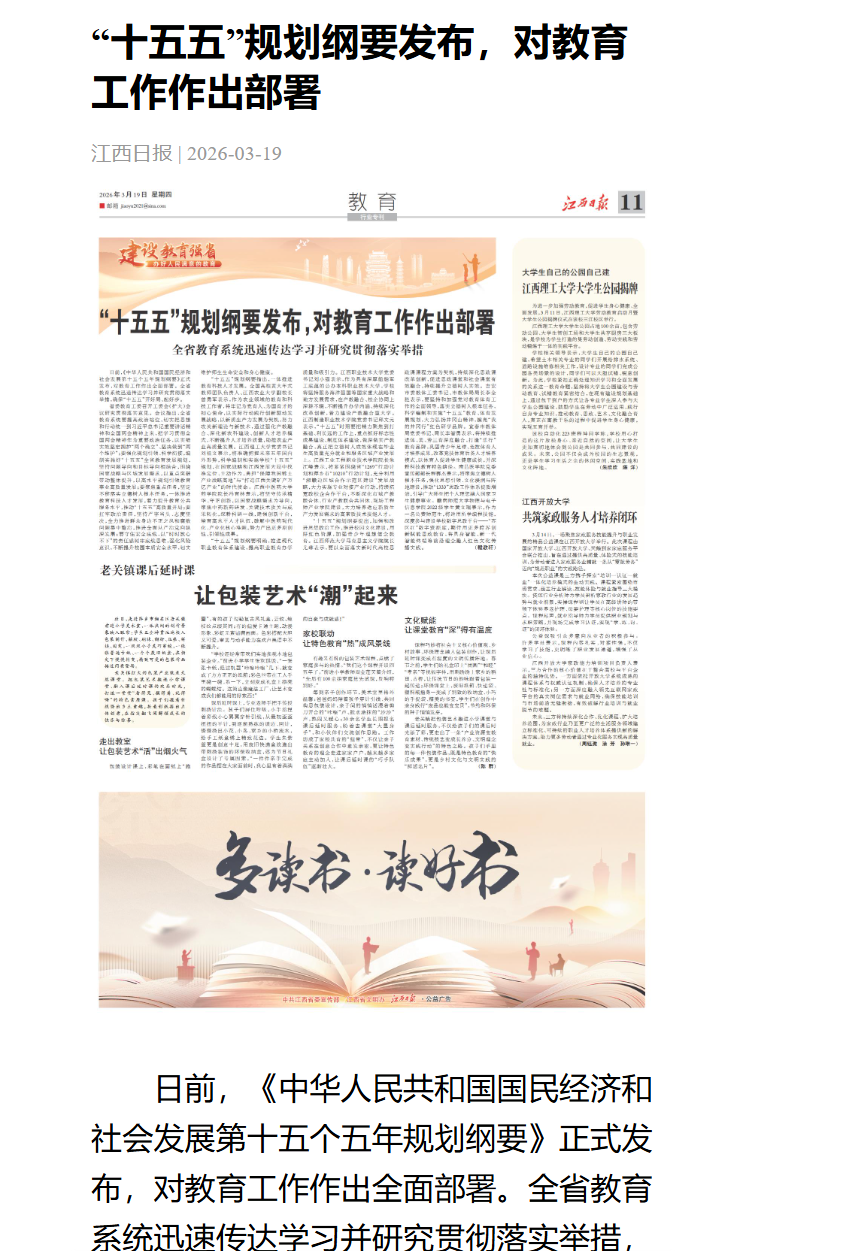 “十五五”规划纲要指出,一体推进教育科技人才发展。全国高校黄大年式教师团队负责人、江西农业大学副校长曾勇军表示,作为农业领域的教育和科技工作者,将牢记为党育人、为国育才的初心使命,以实际行动践行创新驱动发展战略,以新质生产力发展为契机,努力攻关新理论与新技术,通过强化产教融合、深化新农科建设、创新人才培养模式,不断提升人才培养质量,助推农业产业高质量发展。江西理工大学党委书记刘祖文表示,将准确把握未来五年国内外形势,科学编制和实施学校“十五五”规划,在国家战略和江西发展大局中找准定位、主动作为,勇担“保障我国稀土产业战略高地”与“打造江西关键矿产万亿产业”的时代使命。江西中医药大学药学院院长冯育林表示,将坚守传承精华、守正创新,以国家战略需求为导向,聚焦中药新药研发、关键技术攻关与成果转化,深耕科研一线,建强创新平台,培育高水平人才队伍,破解中医药现代化、产业化核心难题,努力产出更多原创性、引领性成果。