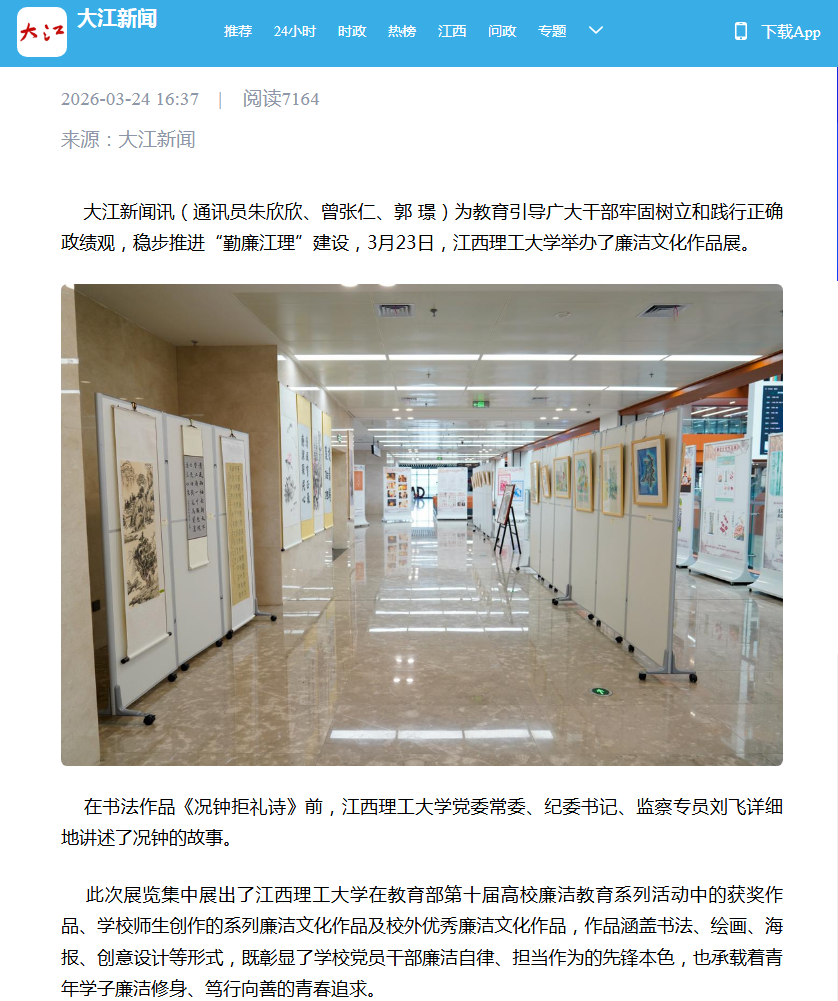 此次展览集中展出了江西理工大学在教育部第十届高校廉洁教育系列活动中的获奖作品、学校师生创作的系列廉洁文化作品及校外优秀廉洁文化作品,作品涵盖书法、绘画、海报、创意设计等形式,既彰显了学校党员干部廉洁自律、担当作为的先锋本色,也承载着青年学子廉洁修身、笃行向善的青春追求。