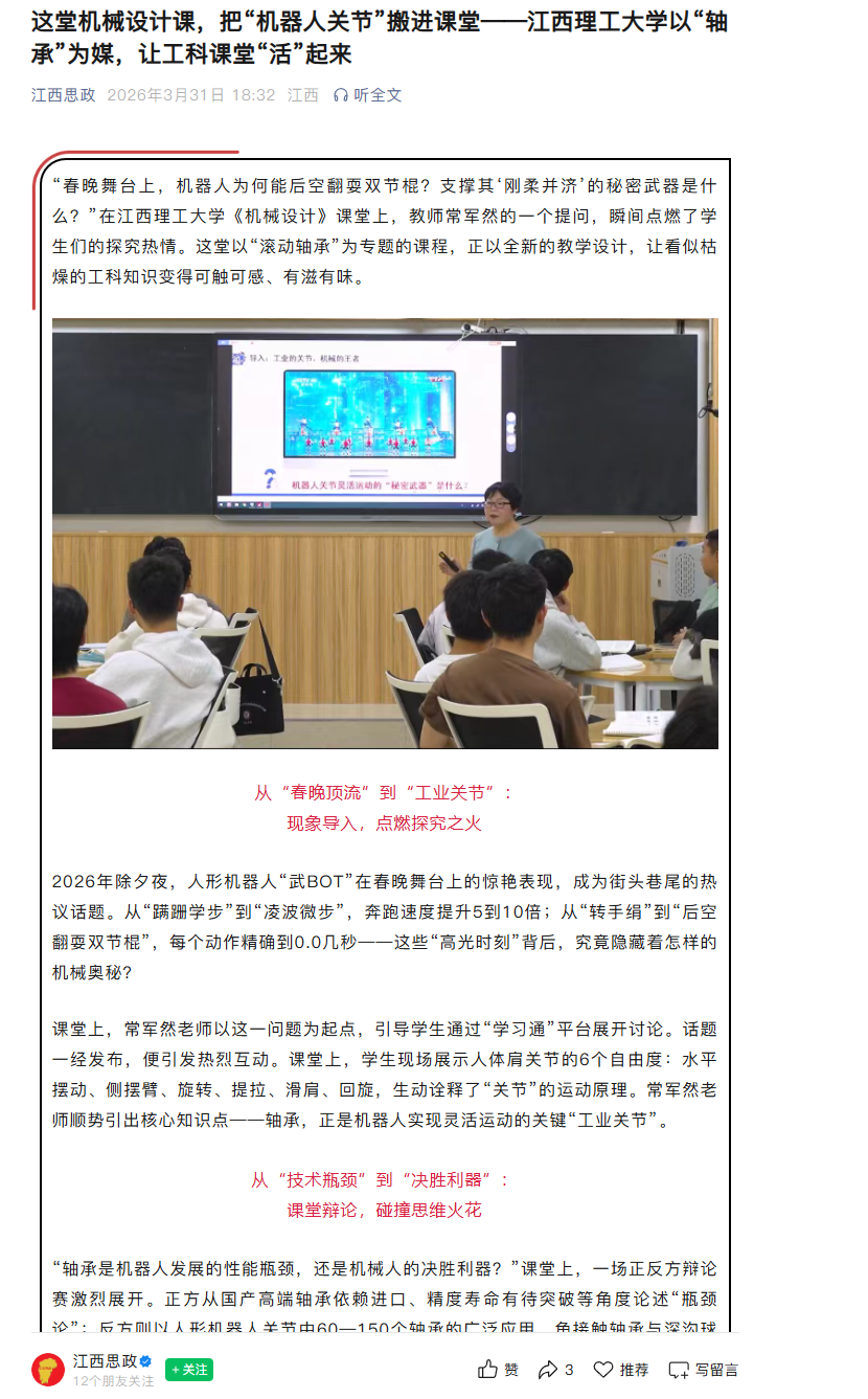“春晚舞台上,机器人为何能后空翻耍双节棍?支撑其‘刚柔并济’的秘密武器是什么?”在江西理工大学《机械设计》课堂上,教师常军然的一个提问,瞬间点燃了学生们的探究热情。这堂以“滚动轴承”为专题的课程,正以全新的教学设计,让看似枯燥的工科知识变得可触可感、有滋有味。