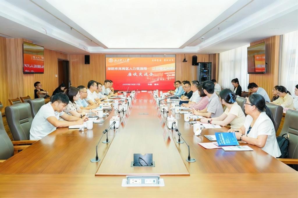 本网讯 10月17日,“百万英才汇南粤”2025年龙岗区校园招聘活动(江西站)在我校三江校区(东园)顺利举行。当天上午,政校企交流座谈会于三江校区(东园)濂溪楼召开。校党委常委、副校长熊志华出席会议并致辞,会议由招生就业处处长邓晓宇主持。