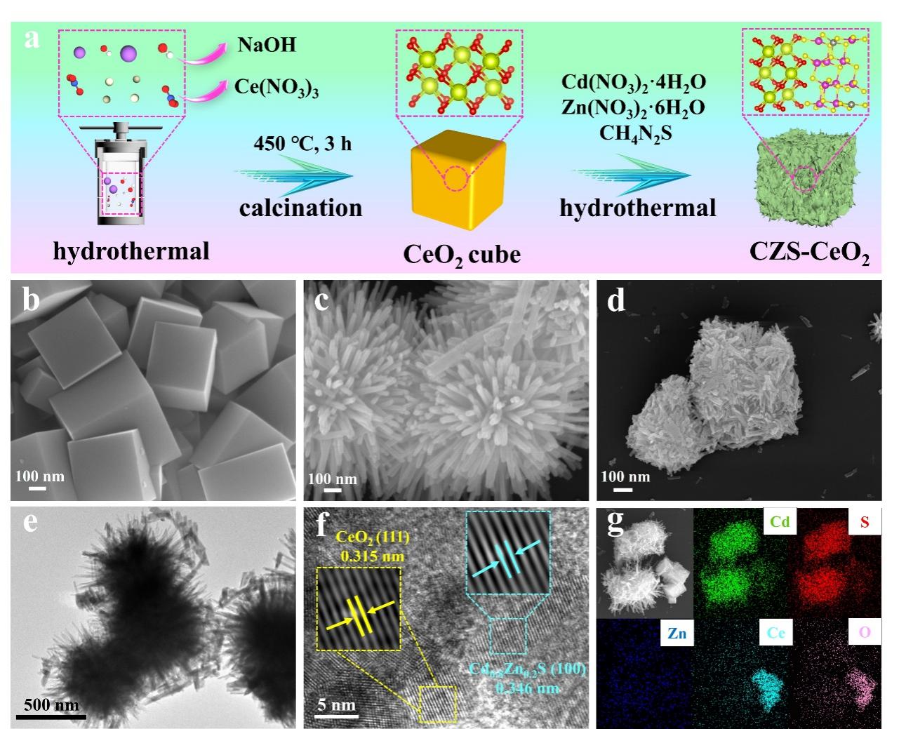 CZS-CeO2异质结的合成示意图如图2(a)所示。通过扫描电子显微镜 (SEM) 和透射电子显微镜(TEM)鉴定了所制备样品的结构和形态。可以看出, CeO2为纳米立方体结构,CZS为纳米线结构,二者紧密接触。此外,如图2(g)所示,CZS-CeO2的元素映射图像显示Cd、S、Zn、Ce和O元素在整个结构中均匀分布,这表明CZS在CeO2纳米管表面上的分布均匀。