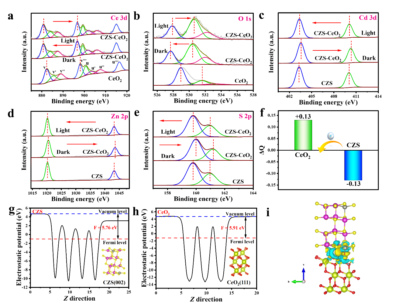 图 4. CZS-CeO2复合材料的(a)Ce 3d、(b)O 1s、(c)Cd 3d、(d)Zn 2p和(e)S 2p的原位X射线光电子能谱图。(f)CZS-15%CeO2复合材料的Bader电荷计算。(g)CZS(002)和(h)CeO2(111)晶面的静电势计算值。(i)CZS-CeO2异质结的差分电荷密度。