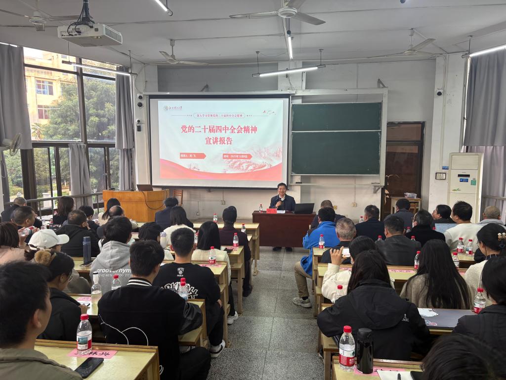 本网讯  为深入学习贯彻党的二十届四中全会精神,激发师生员工干事创业的激情。12月9日,校党委常委、纪委书记、监察专员刘飞在红旗校区主教楼208教室为经济管理学院师生宣讲党的二十届四中全会精神,经济管理学院全体领导班子成员及学生代表参加。