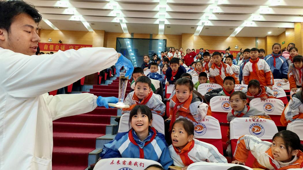 本网讯 12月30日,全国高校“双带头人”教师党支部书记“强国行”专项行动团队、学校化学化工学院应化党支部的党员师生联合江西理工大学电子信息产业学院教工学生联合党支部,走进信丰县思源实验学校校园,为这里的孩子们带来一场别开生面的“化学魔法秀”。